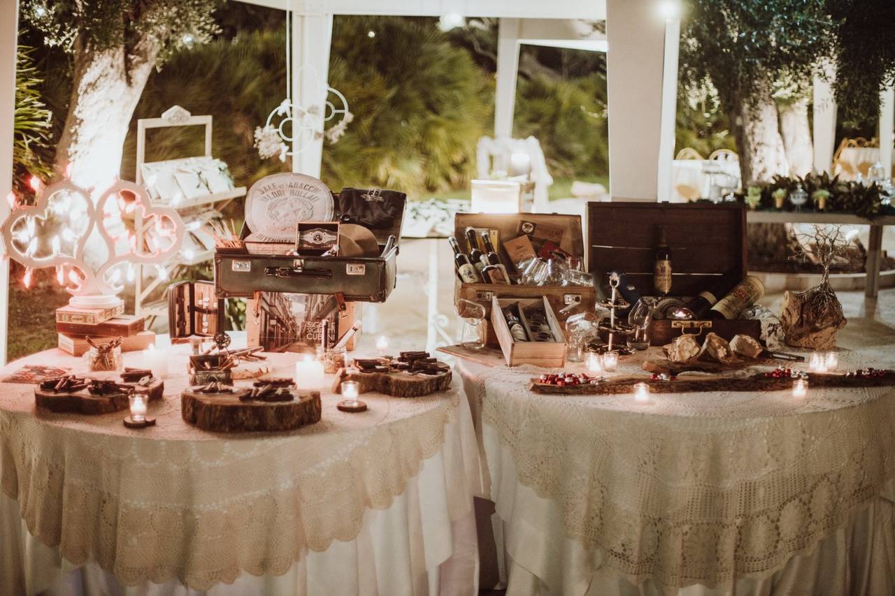 Uno dei trend più distintivi dei matrimoni di alto livello è l’Angolo Rum e Sigari. Non si tratta di un semplice tavolo da buffet, ma di una vera e propria boiserie in legno con tettuccio dedicato, progettata per essere scenografica e funzionale. Questo angolo esclusivo rappresenta un vero e proprio status symbol, diventando il fulcro dell’esperienza di prestigio durante il sopralluogo e l’evento stesso.