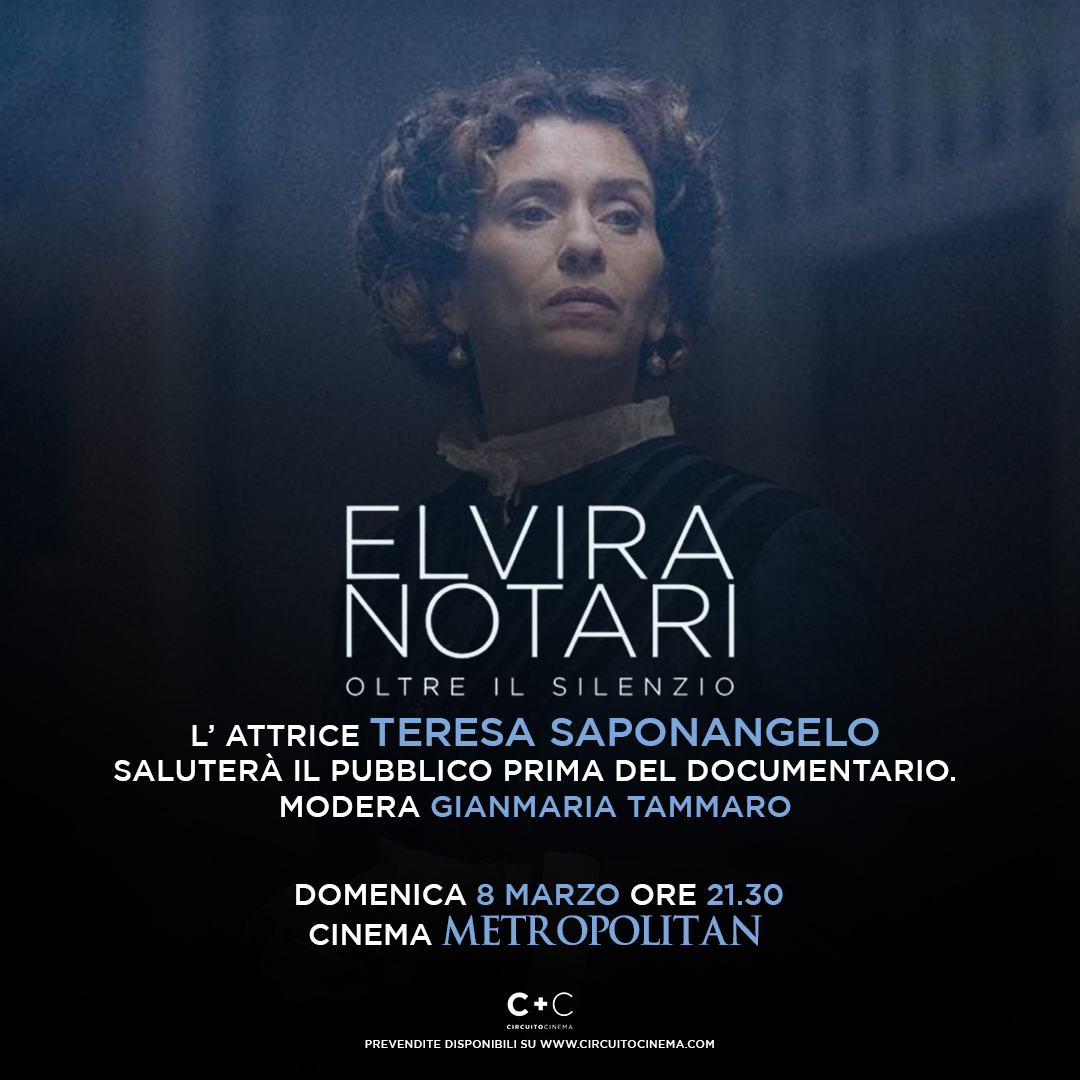 In occasione della Giornata internazionale della donna, domenica 8 marzo alle 21:30 al CinemaMetropolitan di Napoli l’attrice Teresa Saponangelo sarà presente in sala insieme al critico cinematograficoGianmaria Tammaro per introdurre il documentario su Elvira Notari, prima regista italiana della storia.