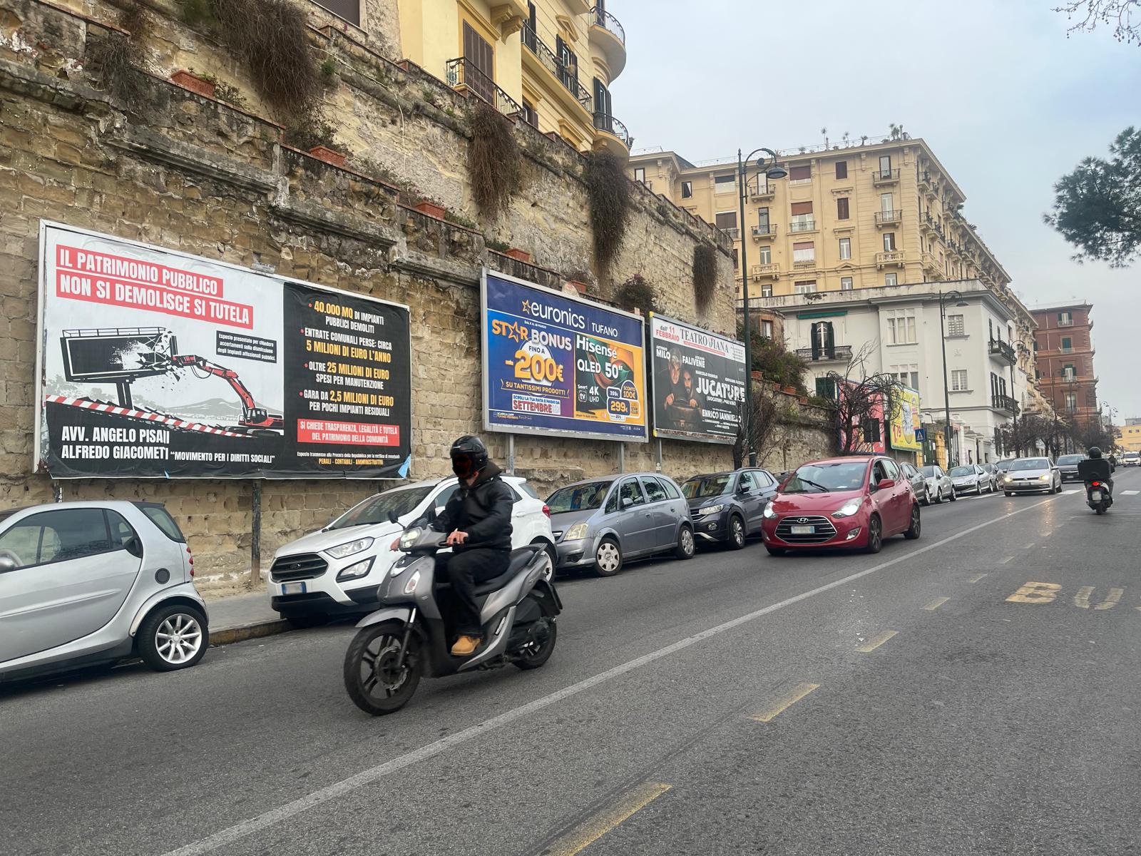 Nel mirino anche la gestione del servizio attraverso la partecipata Napoli Servizi, uno spreco di risorse pubbliche e la sottrazione alla Città di molte risorse che si potrebbero attivare concedendo gli impianti affissionali alle aziende private.