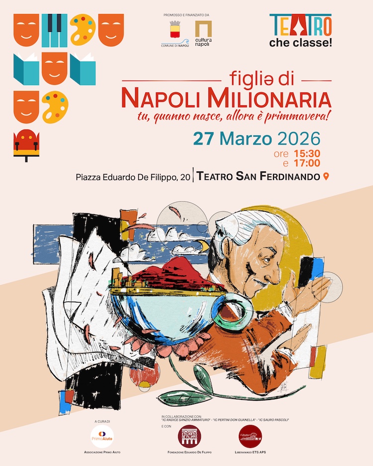 Sarà il Teatro San Ferdinando, tempio della drammaturgia eduardiana, a ospitare il gran finale di “FIGLIǝ DI NAPOLI MILIONARIA! TU, QUANNO NASCE, ALLORA È PRIMMAVERA!”, il progetto teatrale extracurricolare che ha coinvolto 64 studentesse e studenti delle scuole secondarie di primo grado dei territori di Scampia, Secondigliano e Poggioreale.