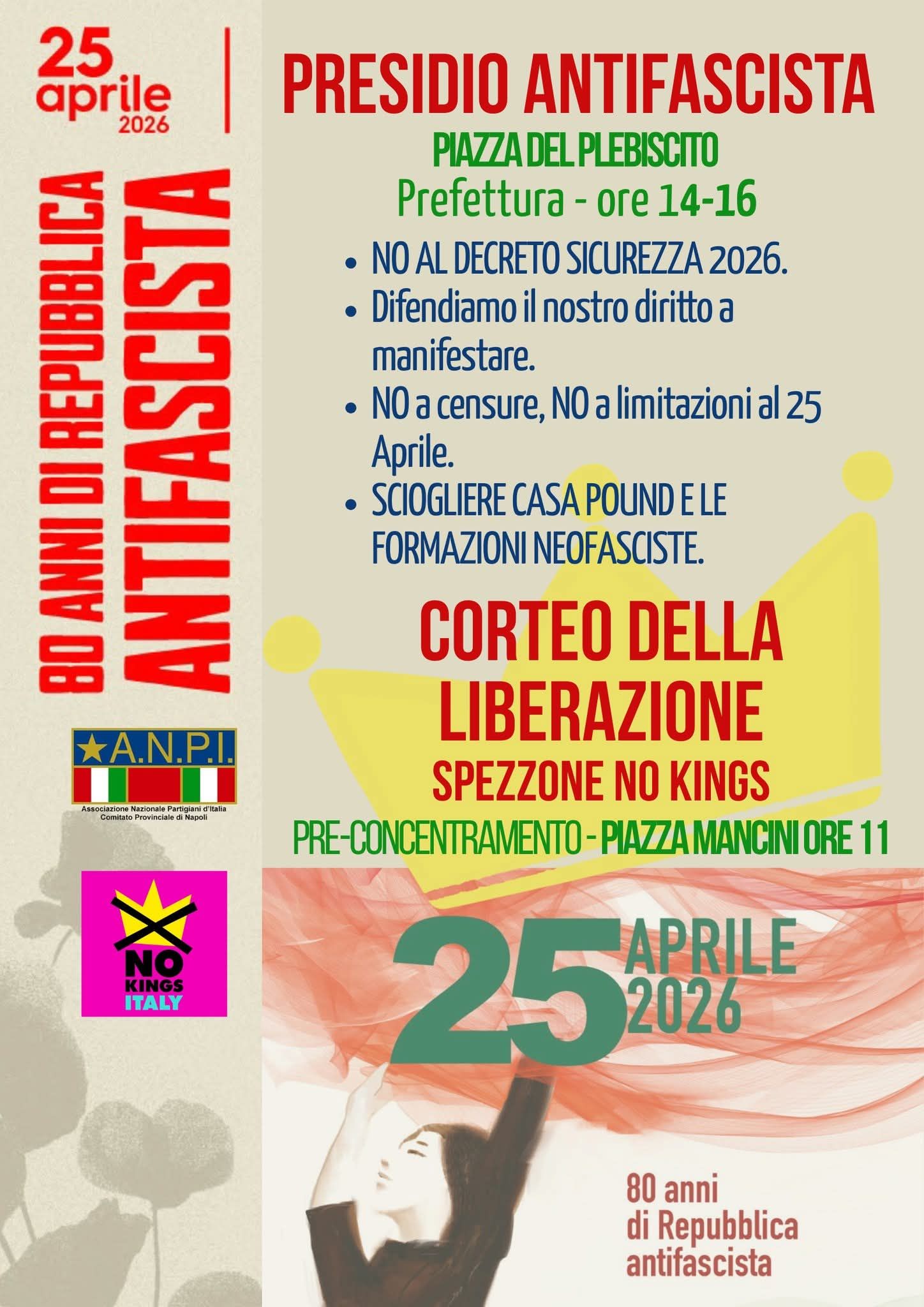 Tra gli appuntamenti principali segnalati dalla locandina c’è il presidio antifascista in Piazza del Plebiscito, davanti alla Prefettura, in programma dalle ore 14 alle 16.